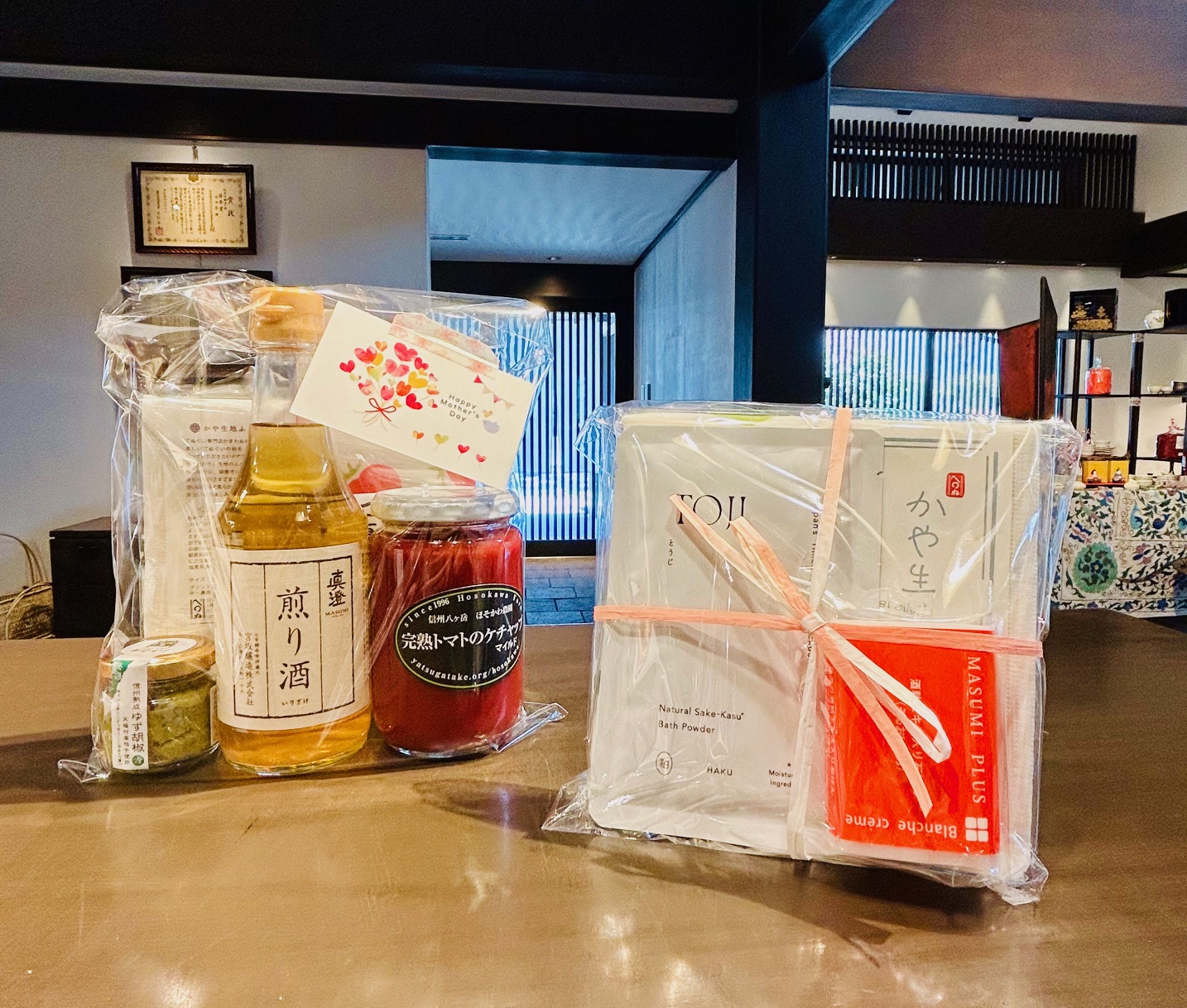 蔵元ショップでは、季節限定の日本酒や調味料、雑貨類等を詰め合わせたおすすめギフトを各種ご用意しております。