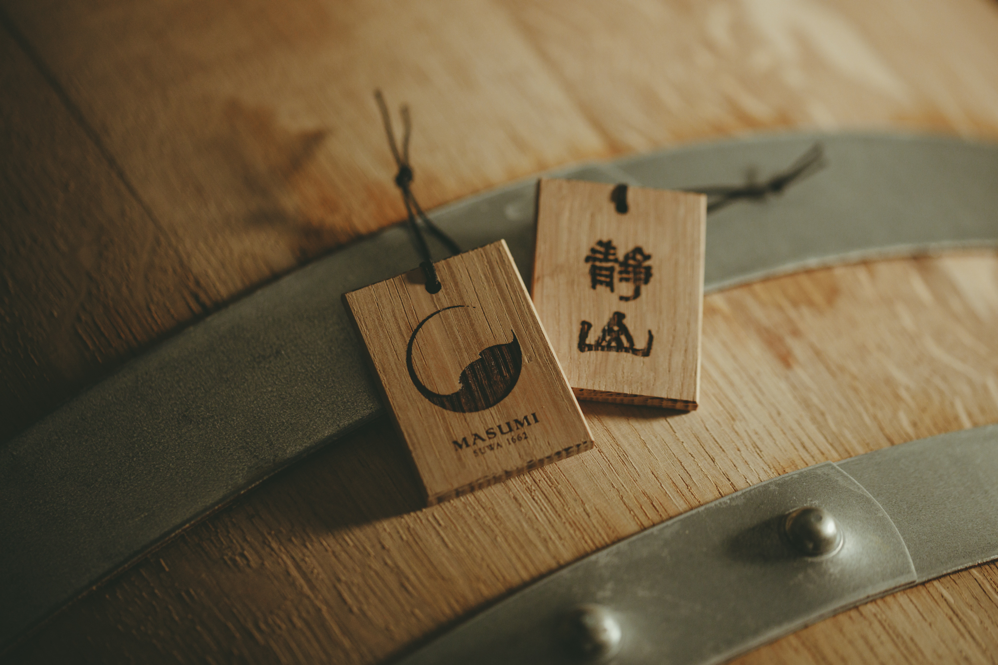 静山の熟成に使用したオーク樽を、オリジナルウッドタグに仕立てました。