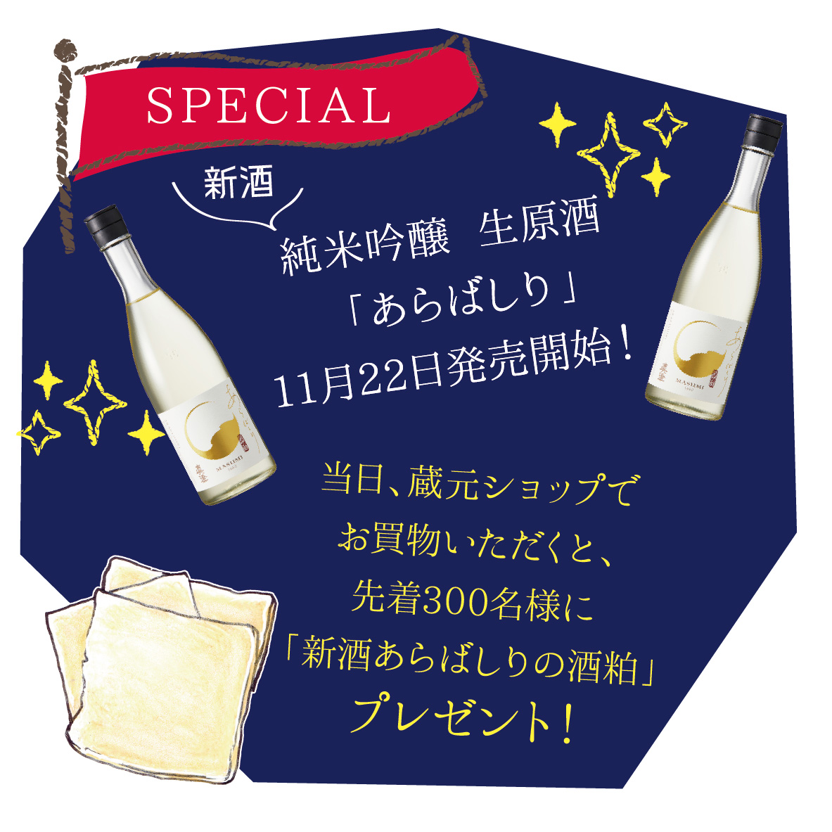 また、11月22日(土)の販売日当日に店頭にてお買い物いただいた方へ、先着300名様に「新酒あらばしり」の酒粕をプレゼントさせていただきます!